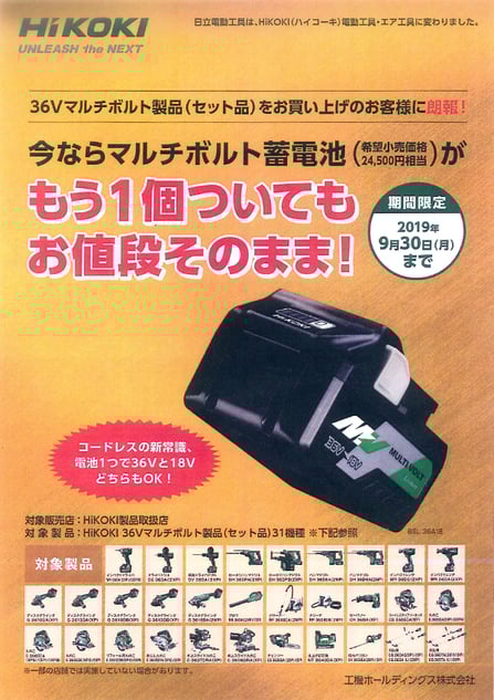 期間限定 2019年9月30日迄 HIKOKI 36Vシリーズセット品に朗報 さらに1個プレゼントセール中