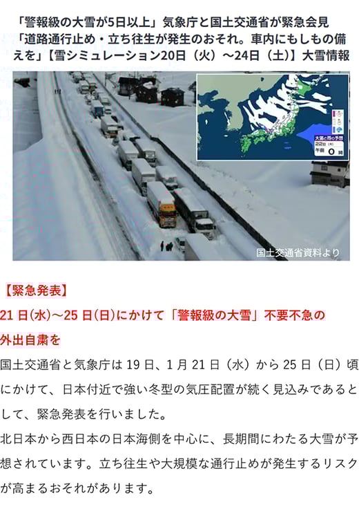 警報級の大雪が5日以上続く恐れがあるとして、不要不急の外出を控えるよう呼びかけました。 21日には、関東南部の箱根や東京でも雪が降る可能性が出ています。